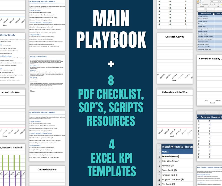 Roofing Review and Referral Engine Playbook + Scripts (phone, SMS, email, & in-person)+ SOPs + Checklists + Excel KPI Dashboards, Referral Club Kit, and A 90-Day roadmap system to fully running referral engine